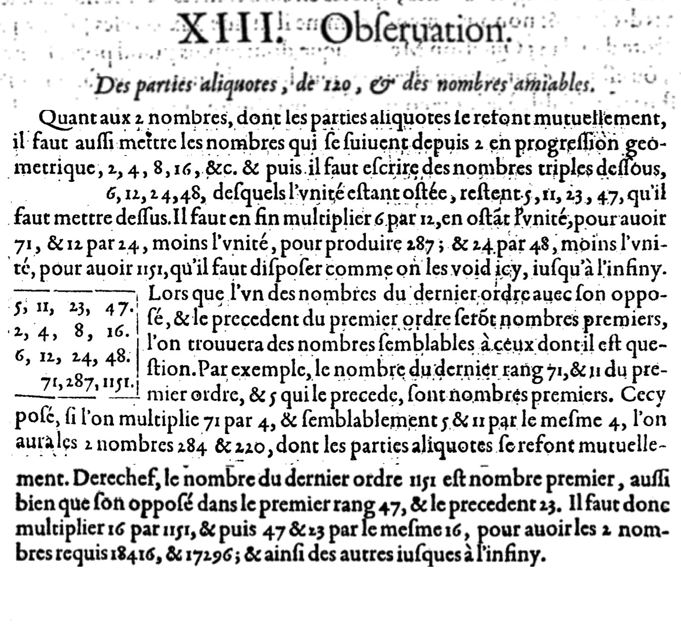 Clearly any perfect number is amicable with itself. The smallest pair of unequal amicable numbers is \((220,284)\text{.}\) This was known by the time of late Greeks antiquity, cherished by some medieval Muslims, and apparently was not improved upon until the modern number-theoretic era 2 . See if you can find this one in the following image 3 from an appendix of sorts to the Harmonie Universelle, Mersenne's monumental compendium of practical and theoretical music.