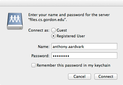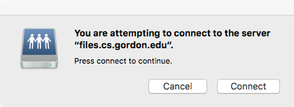 To follow these steps, you will need a directory on the department file server. Each student enrolled in a class that needs to use this server will have an individual directory created for them on the server. The username and password will be the same as your Gordon email name and password.