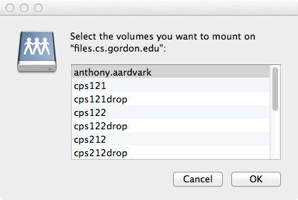 To select a single volume, select it in the drop down, and click "OK". Note: If you need to select more than one volume (e.g. if the lab directions call for mounting both your own volume and the common volume) then you will have to go through most of the process twice - once for each volume - though you won't be asked to confirm access or enter your username and password again. There does not seem to be any way to select to mount two shares at once.