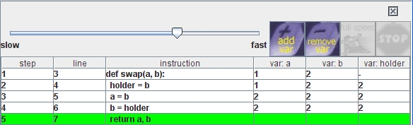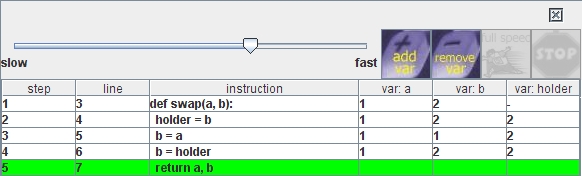 Gimme some code! In order to use a debugger, the first thing you need is some code. So, here it is: # this function performs a swap of # two parameters def swap(a, b): holder = b a = b b = holder return a, b This program is supposed to swap the input parameters, load it into your JES editor. So, suppose you do this in the command window: >>> a = 1 Variable a should be left with the original value of b - 2,